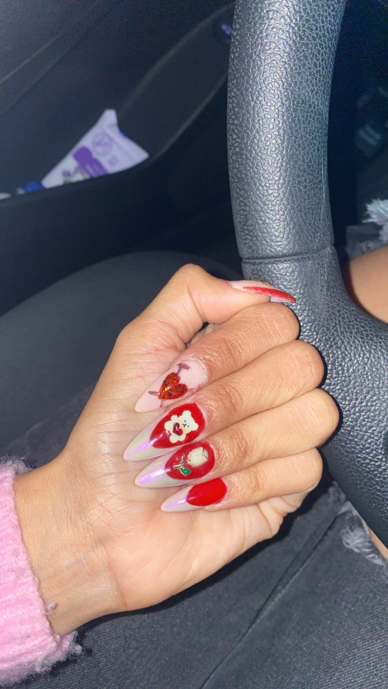 Red and pink iridescent French tip teddy bear and tulip Valentine’s Day set 🧸🌷🫀